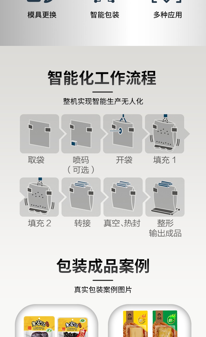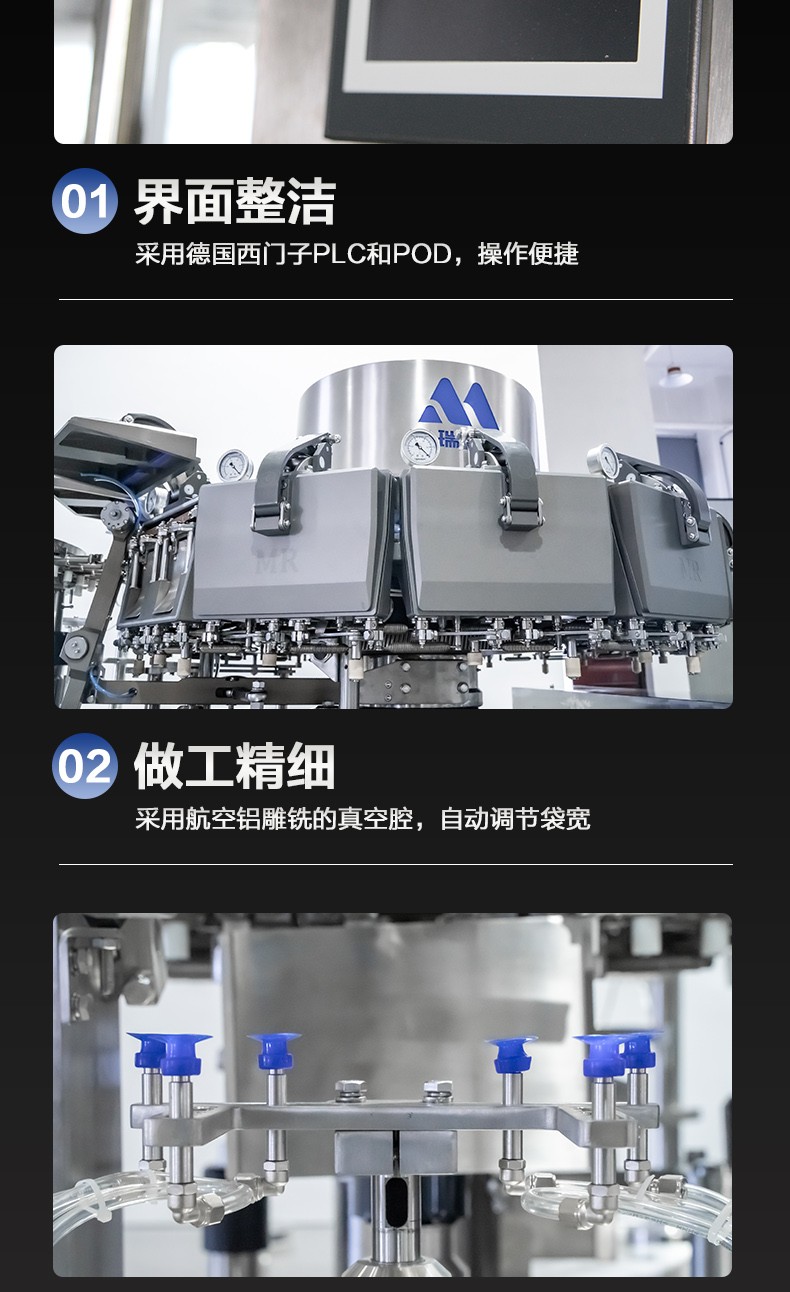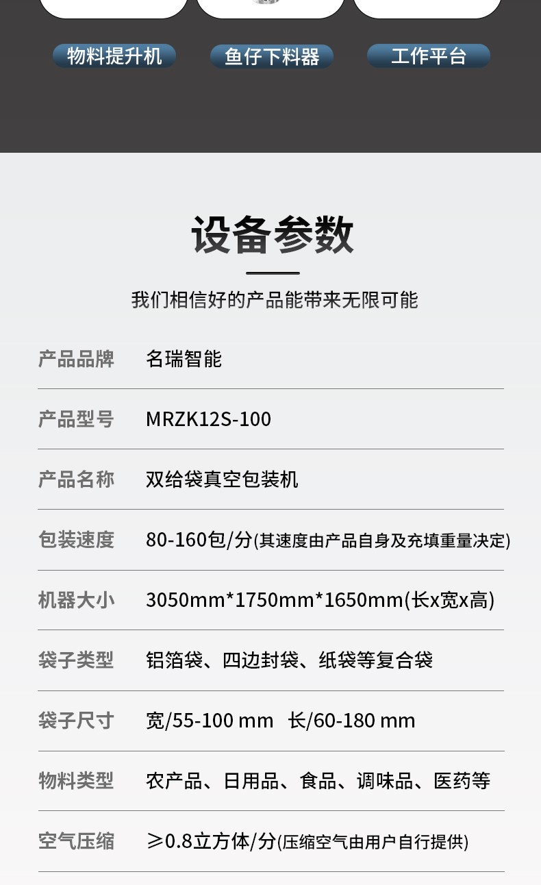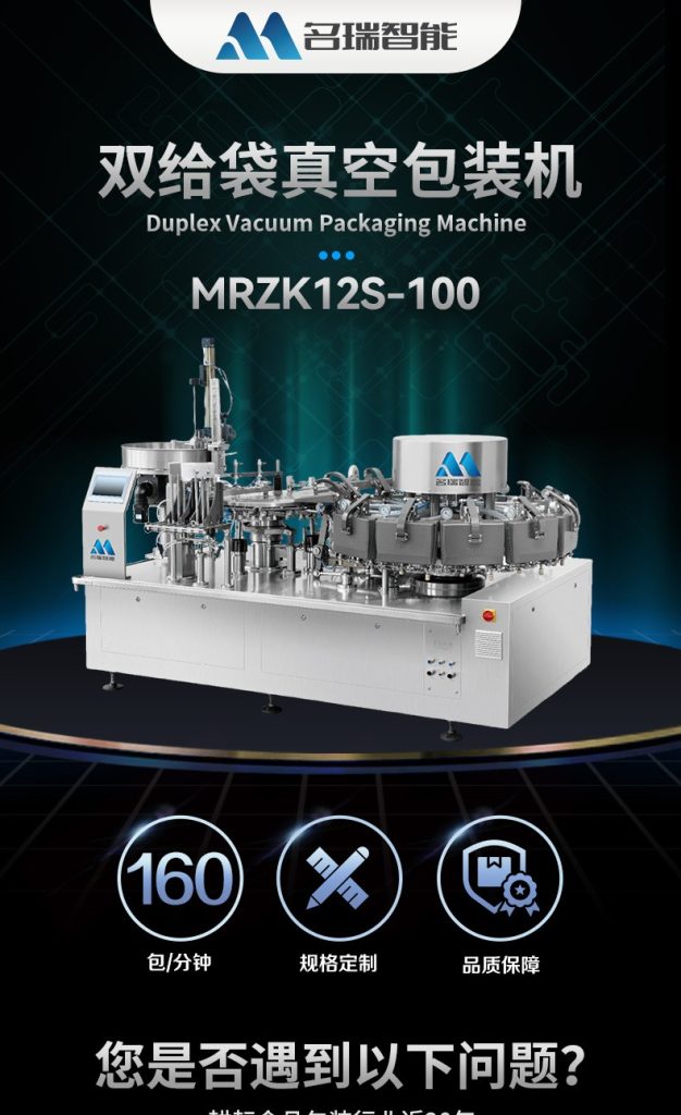 MRZK12S-100是我們?yōu)闈M足更高生產(chǎn)需求的客戶設(shè)計(jì)的一款雙上袋給袋式真空包裝機(jī),這款設(shè)備可以一次包裝封口兩袋產(chǎn)品,從而提高生產(chǎn)速度,可以選配的下料器有:雙環(huán)形下料器,鹵蛋下料器雙下料版,雙活塞下料器,收縮杯下料器雙下料版。